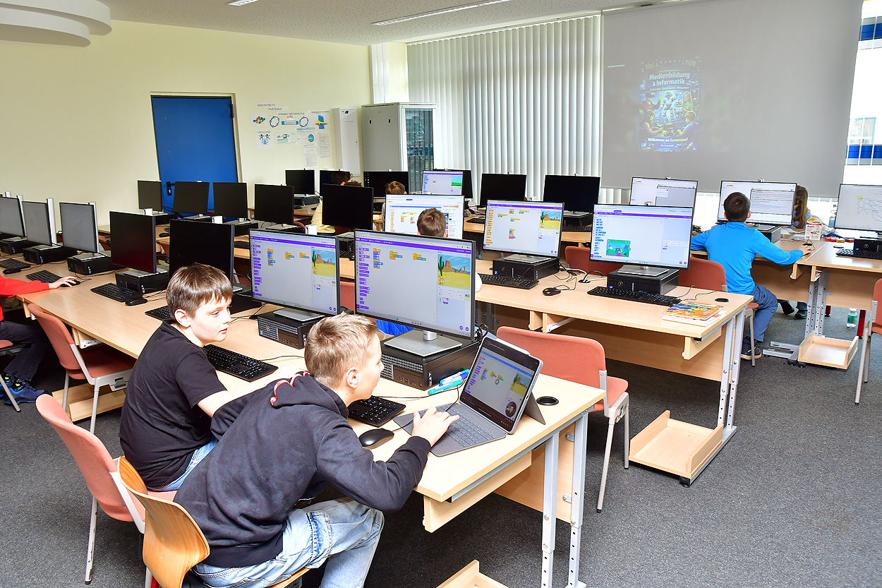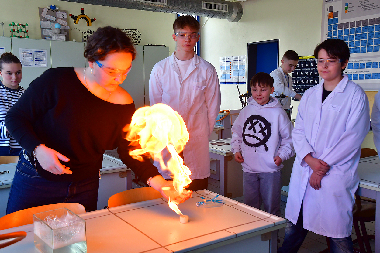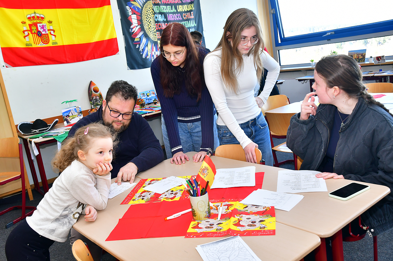 Schüler, Eltern und vor allem zukünftige Schüler blickten neugierig hinter die Kulissen des Gymnasiums. Die Vielfalt der Unterrichtsfächer begeisterte die zahlreichen Besucher. Es wurden staunend Chemie- oder Physik-Experimente durchgeführt, Rästel u.a. in Geografie, Mathematik, Deutsch konnten gelöst werden, Stoffbeutel wurden in den Kunsträumen bedruckt, Sprachen gingen buchstäblich durch den Magen durch ein Speisenangebot im Foyer mit landestypischen Köstlichkeiten.